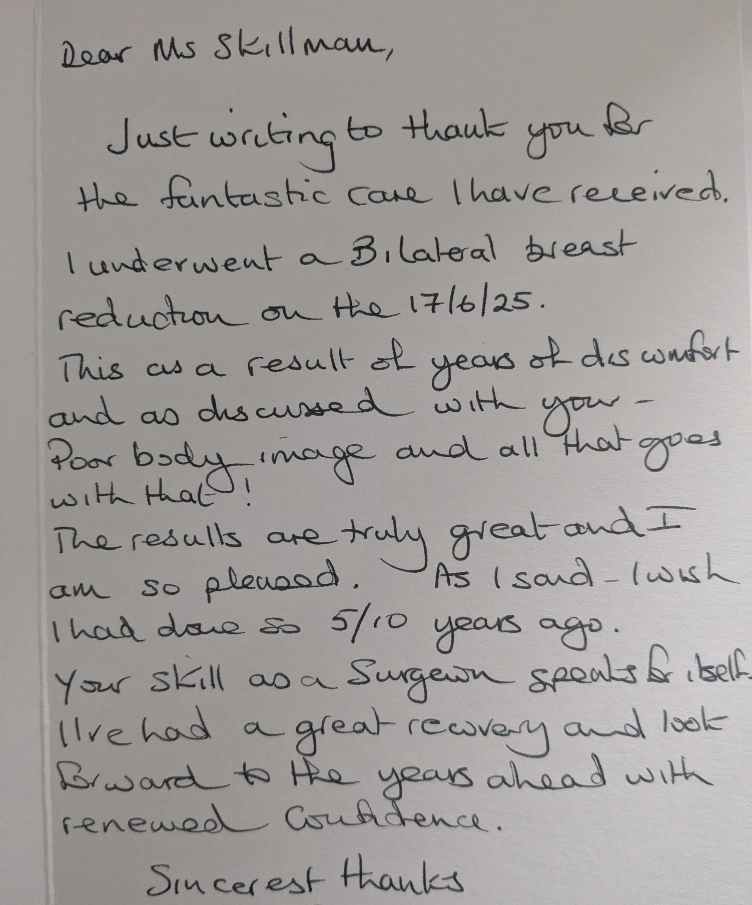 Just writing to thank you for the fantastic care I have received. I underwent a Bilateral breast reduction on the 17/06/25.