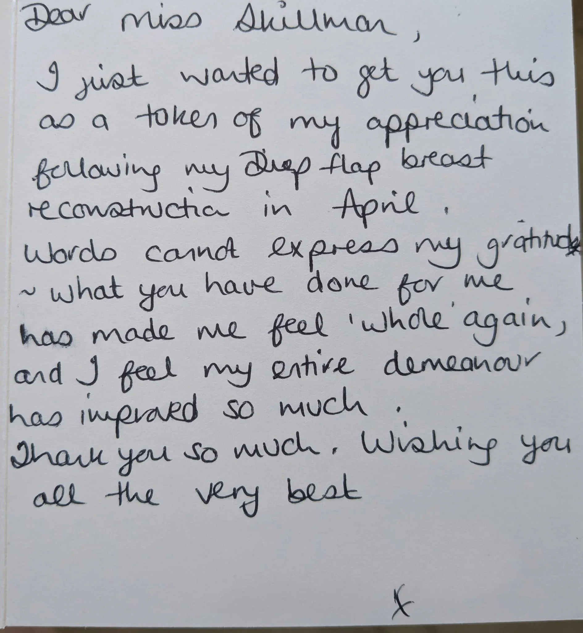 What can I say! I have no words really. You truely are the most wonderful, talented, respected and kind professional, I have ever had the pleasure of meeting. I know when I have shared how amazing you are before, you play down the compliment. You will always be someone who has played a huge impact on my life. You have kept me cancer free and there are no words to express my thanks. The BRCA 1 cancer gene has always felt scary to carry and now I can move on, with my new “Tummies” (as I now call my boobies) and flat tummy. If ever you choose to have a retirement party, I am there!! I hope you like your gift. Wishing you all the best, happiness and luck for the future.