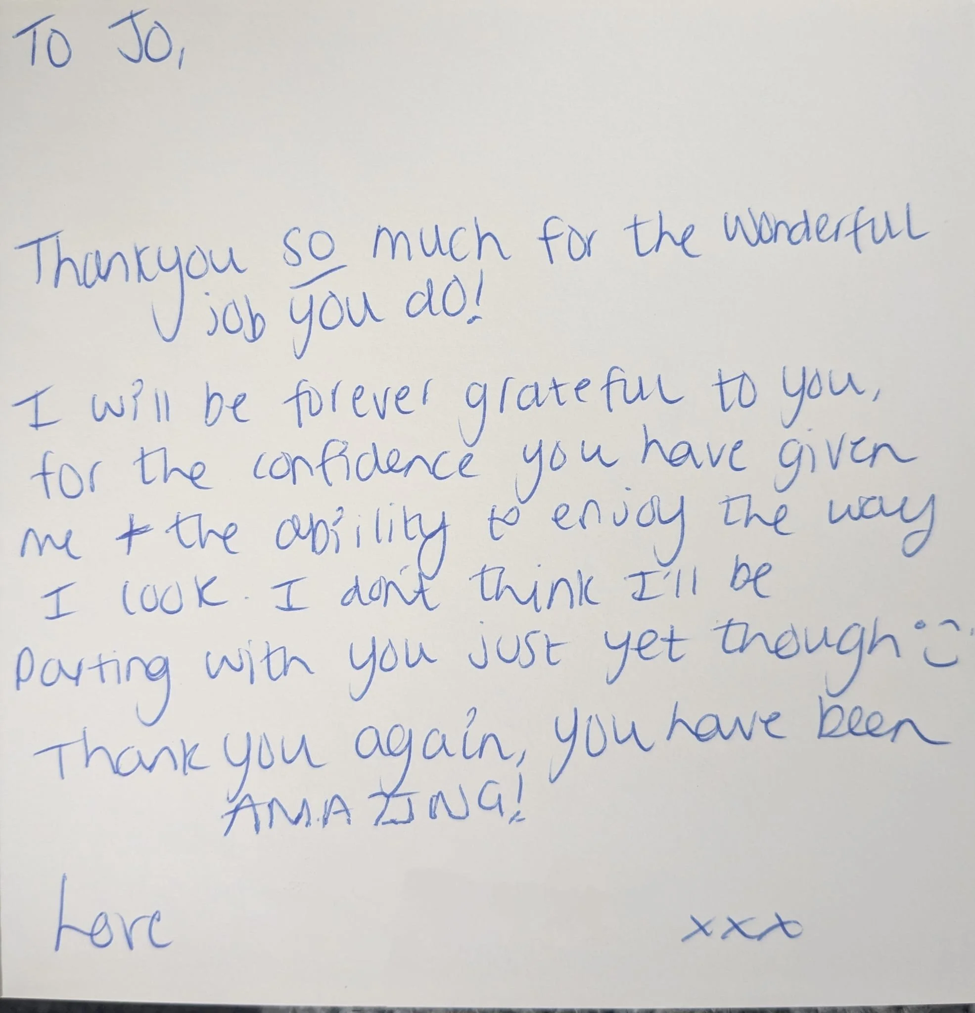 I will be forever grateful to you, for the confidence you have given me + the ability to enjoy the way I look. I don’t think I’ll be parting with you just yet though