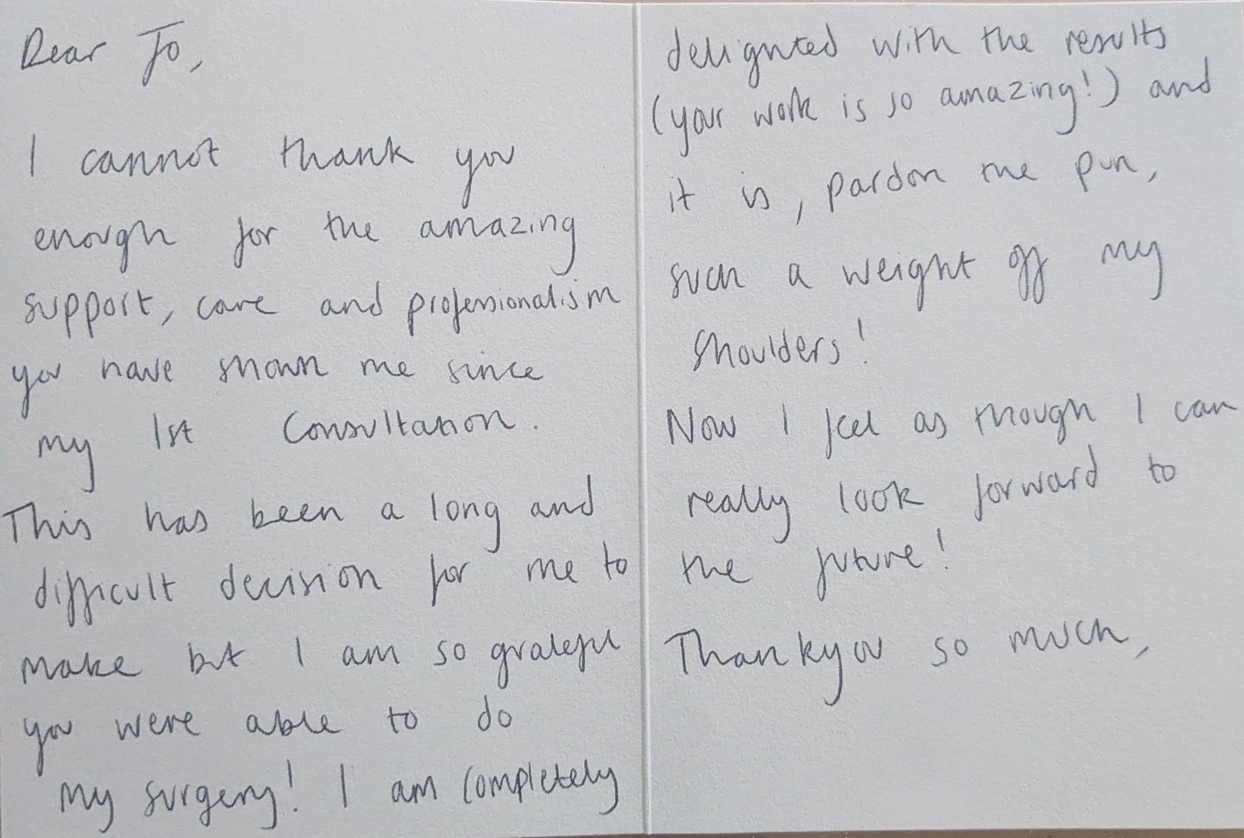 I just wanted to say a huge thank-you for taking such great care of me, and making something that could be quite scary such a wonderful experience!