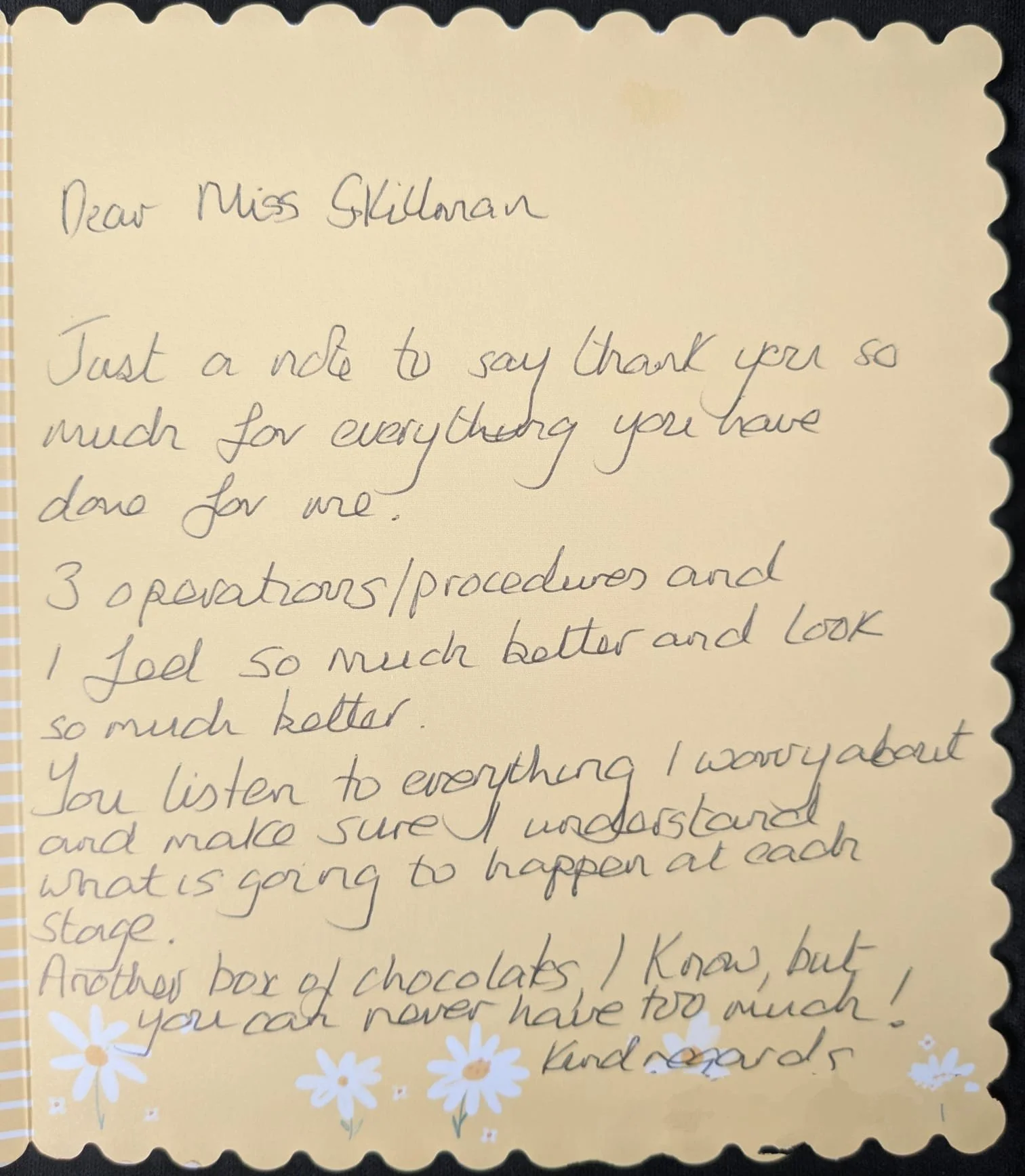 For many years I'd been unhappy with my tummy and finally got the courage to do something about it. From my first appointment with Miss Skillman I knew I was in safe hands. She is kind, caring and wasn't phased by my list of questions. She explained everything so I could understand and it was clear that she is an expert. Miss Skillman undertook both procedures together and the aftercare I received from both her and the nurses who looked after me on the ward was first class. I am now a different person and I am so grateful to Miss Skillman for making me the new me. Thank you. x