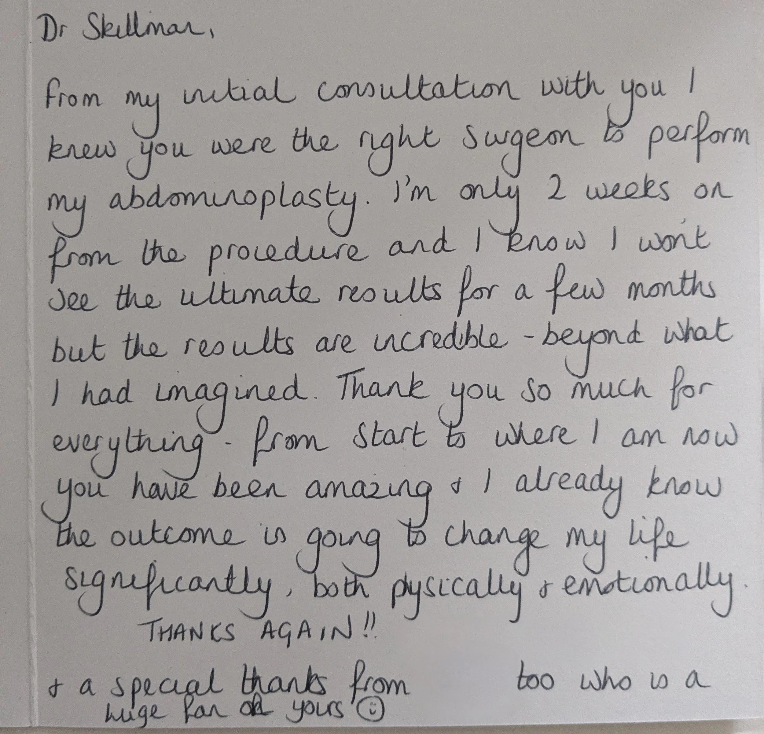 Also, I'm sure you also hear this a lot, but every single person I have been in contact with in the hospital speaks so highly of you, their faces light up when they know you are the surgeon, everyone is so positive about you, and this really has been such a positive experience for me from start to finish. I'm sure you are one of a kind.